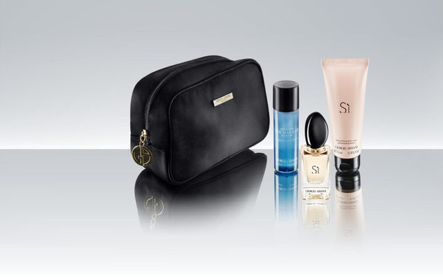 Giorgio Armani Fragances mima a los pasajeros con sendos estuches de aseo personal. El de ellos incluye crema de afeitar Acqua di Gio y una minitalla de la fragancia Armani pour Homme, junto a otros productos para el cuidado de la piel.