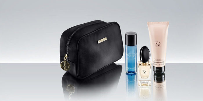 Giorgio Armani Fragances mima a los pasajeros con sendos estuches de aseo personal. El de ellos incluye crema de afeitar Acqua di Gio y una minitalla de la fragancia Armani pour Homme, junto a otros productos para el cuidado de la piel.