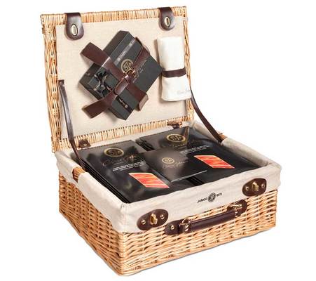 Para almuerzos campestres inolvidables. Esta tradicional cesta de mimbre forrada, con cierres y asa exterior, incluye 26 sobres de 80 gramos del mejor jamón ibérico loncheado (cortado a mano), un plato especial y un paño de hilo, sujetos a la perfección al interior de la cesta de picnic gracias a unas pequeñas correas. Precio: 605 euros.