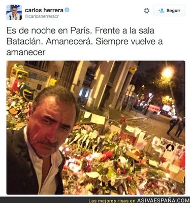 Es más que evidente que hacerse un selfie en un lugar que acaba de ser escenario de uno de los atentados terroristas más sangrientos de la historia de Europa pues como que no es muy buena idea… Aún así, Carlos Herrera no es un millenial, es la anti- post modernidad en redes sociales así podemos afirmar que, consultando su Twitter, todo lo que postea es relativo a platos de comida, algo muy odiado y muy «cuñado».