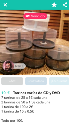 Seguro que recuerdas estas tarrinas de cd’s. Hace años se usaban sin parar para guardar esos discos en los que se grababan las fiestas de fin de curso o las bodas y comuniones. Pero hoy en día, ¿Quién usa esto? Pues alguien las seguirá usando, aunque no tenemos claro si para guardar cd’s o para otra cosa, ya que Iván consiguió venderlas por Wallapop.