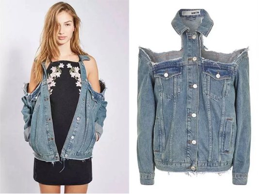 Otra de las prendas ridículas con las que me he topado, o al menos a mí me lo parece, es esta chaqueta vaquera cortada por los hombros. Y no es que le corten las mangas y pase a ser un chaleco, no, sino que cortan la parte de los hombros para dejarlos al aire. Eso sí, el cuello que ni lo toquen.