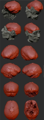 Utilizando los datos de la tomografía computarizada, los investigadores pudieron realizar una reconstrucción de la superficie del cerebro en 3D, lo que les permitió reconstruir tejidos blandos destruidos o modificados por alteraciones post mortem.