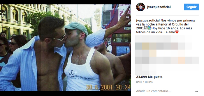 «Nos vimos por primera vez la noche anterior al Orgullo de 2001. Hoy hay 16 años. Los más felices de mi vida. Te amo». Jesús Vázquez y Roberto Cortés contrajeron matrimonio en el año noviembre de 2005 en una ceremonia íntima oficiada por la entonces diputada socialista Trinidad Jiménez.