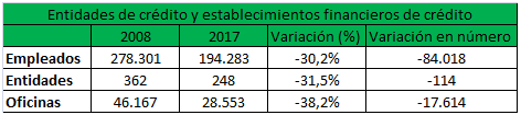 Pues bien, la situación de la banca en 2008 era bien distinta a la actual. Te podías dar una vuelta por cualquier zona de Madrid y casi a cada esquina encontrarte con una sucursal bancaria. Situación que también se vivía en las grandes ciudades y no era para menos puesto que en España contábamos con 46.167 oficinas de la banca de 362 entidades de créditos distintas y que daban empleo a un total de 278.301 trabajadores. Pues bien, casi una década después estos datos de la banca se han reducido y con fuerza puesto que únicamente hay 28.553 oficinas de 248 entidades a cierre del primer trimestre de 2017 mientras que el número de empleados de la banca es de 194.283 trabajadores a 31 de diciembre de 2016.