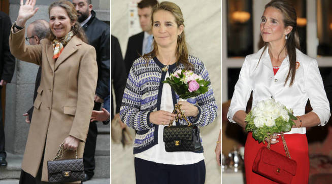 Sin embargo, los complementos van aparte: el rey Felipe siempre luce un buen reloj, la reina Letizia siempre luce buenas joyas y la infanta Elena, efectivamente, luce presume de buenos bolsos en su colección.