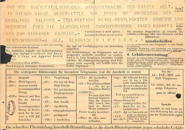En el cable, que los archiveros creen que Himmler envió en 1943, los nazis más arriba ofrecieron «cálidos deseos por su continua lucha contra los invasores judíos hasta la gran victoria«.