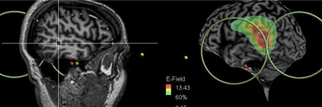 El tratamiento TMS implicó una serie de pulsos magnéticos de alta frecuencia de 20 Hz durante dos sesiones al día durante dos días. Mediante resonancia magnética (IRM), los pulsos se dirigieron a un área cerebral específica en el lóbulo temporal, asociada con el lenguaje (el área exacta es el cruce de la proyección de la rama ascendente del surco lateral izquierdo y el surco temporal superior izquierdo).