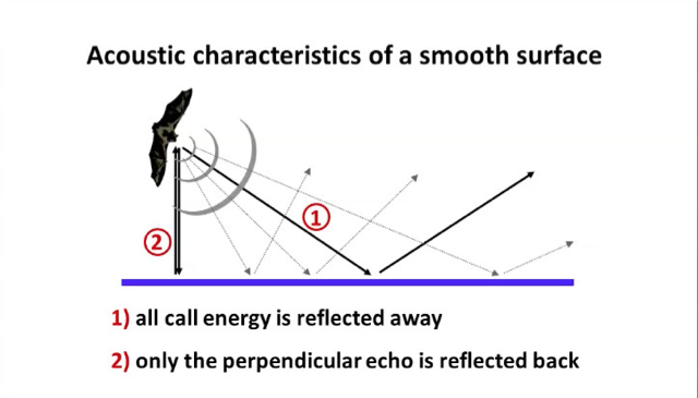 Las superficies lisas son el equivalente acústico de los espejos. Y mientras que los murciélagos instintivamente saben que la falta de ecos desde abajo puede ser un estanque o un lago, parecen asumir que los vacíos verticales son lagunas.