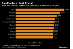 Wall Street ha absorbido este mes acuerdos por bonos basura de Tayikistán y Bahréin, ambos considerados entre los regímenes más autocráticos en la clasificación de Freedom House, con sede en Washington. La demanda de la deuda de la república de Asia Central fue tan alta la semana pasada que pudo reducir los costes de financiación casi un punto porcentual entero respecto a su objetivo inicial. El reino de Oriente Medio vendió deuda por US$3.000 millones este miércoles, su mayor venta en la historia.