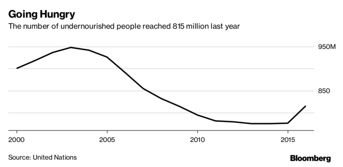 A inicios de años Sudán del Sur se declaró en hambruna. Mientras tanto, Nigeria, Somalia y Yemen sufren la escasez de alimentos. El aumento de la desnutrición también es consecuencia del incremento en los precios de la comida, los cuales se recuperaron de un descenso de siete años, incluso en medio un exceso mundial de granos.