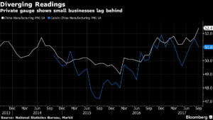 Ese resultado podría ser una buena noticia. Sin embargo, no todas las fábricas disfrutan de las mismas condiciones, como mostró un indicador del sector privado. El índice de gestores de compras (PMI en inglés) de Caixin Media y Markit Economics, que examina el sentimiento entre un grupo representativo de pequeños y medianos productores, cayó de 51,6% a 51% en septiembre. Las lectura indica un ritmo de crecimiento más lento que la encuesta oficial.
