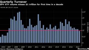 El volumen de operaciones trimestrales en el mayor fondo negociado en Bolsa (ETF por sus siglas en inglés) que sigue al S&P 500, cayó por debajo un billón de dólares (850.000 millones de euros) por primera vez desde 2007, según Eric Balchunas de Bloomberg Intelligence. Las operaciones de ETF se recuperan durante los grandes eventos, dado que los inversores cubren y mueven posiciones con exposiciones amplias.