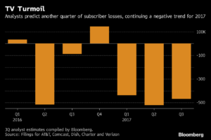 Salvo una importante recuperación en el cuarto trimestre, 2017 está camino a ser el peor año para las pérdidas convencionales de suscriptores de televisión paga en la historia, superando los 1,7 millones del año pasado, según Bloomberg Intelligence.
