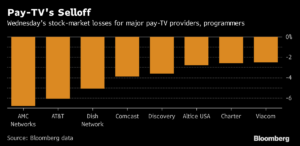 AT&T se hundió 6,1%, la mayor pérdida desde noviembre de 2008. Dish, que también proporciona servicios por satélite, disminuyó 5,1%. Viacom cayó 2,5%, mientras que AMC Networks cayó 6,8% después de que Guggenheim Securities rebajó las dos acciones a neutral desde un grado de compra.