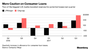 Las acciones de JP Morgan Chase y Citigroup cayeron después de que los bancos aumentaran sus reservas para pérdidas por préstamos de consumo en su mayor nivel en más de cuatro años. Ambos prestamistas reservaron dinero en el tercer trimestre porque esperaban que las amortizaciones para los préstamos con tarjeta de crédito subieran en los próximos períodos, y Citigroup dijo que el aumento se acerca más rápido de lo que anticipaba.
