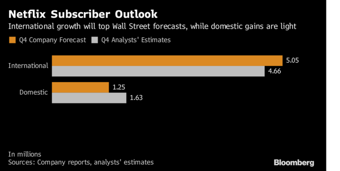 Con los precios en alza, la compañía de California, espera generar 5,05 millones de nuevos clientes fuera de los Estados Unidos en el cuarto trimestre actual, por encima del promedio de 4,66 millones que proyectan los analistas. La compañía busca salir a la luz, prediciendo 1,25 millones de nuevos suscriptores en los Estados Unidos, en comparación con la predicción de los inversores alrededor de 1,63 millones.