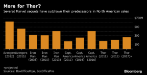 La compañía confía en que el nuevo Thor superará a sus predecesores, según Alan Horn, presidente de Walt Disney Studios. En parte debido a menos lanzamientos en 2017, las ventas domésticas de taquilla del gigante de entretenimiento han caído 35%, según el investigador Box Office Mojo. El lanzamiento de 2013, Thor: The Dark World, producido por 170 millones de dólares (144 millones de euros), recaudó 206,4 millones de dólares (174,9 millones de euros) en los Estados Unidos y 644,6 millones de dólares en todo el mundo.