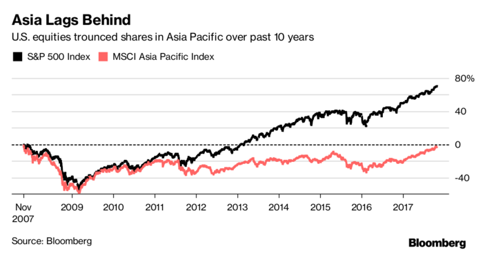 A pesar del repunte en las acciones tecnológicas, el índice MSCI Asia Pacific ha quedado rezagado respecto al S&P500 en la última década. El índice de acciones de los Estados Unidos es ahora 60% más alto que su pico pre crisis financiera.