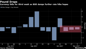 El gobernador del Banco de Inglaterra, Mark Carney, indicó que el siguiente cambio de tasa podría depender del resultado del Brexit. Los mercados cambiarios ahora valoran otro aumento de 25 puntos básicos en septiembre de 2018. Esto podría coincidir con cualquier acuerdo sobre el Brexit, debido a que el jefe negociador de la UE, Michael Barnier, quiere concluir las conversaciones en octubre del año próximo.