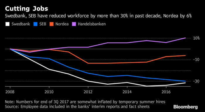 Svenska Handelsbanken se destaca como un importante banco sueco por haber agregado puestos de trabajo durante la última década. También ha sido franco en su compromiso de mantener sucursales. Pero en general, las entidades financieras más grandes de Suecia han reducido su red de oficinas en el país en aproximadamente 30%.