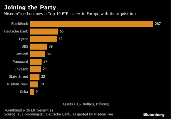 El acuerdo de WisdomTree para comprar ETF Securities con sede en Londres es el segundo en Europa. Antes compró una participación en Boost en 2014, un acuerdo que le dio a la empresa una plataforma para emitir en la región. La última le da únicamente más influencia. ETF Securities opera más de 300 productos, enfocados en materias primas, divisas y apalancamiento.
