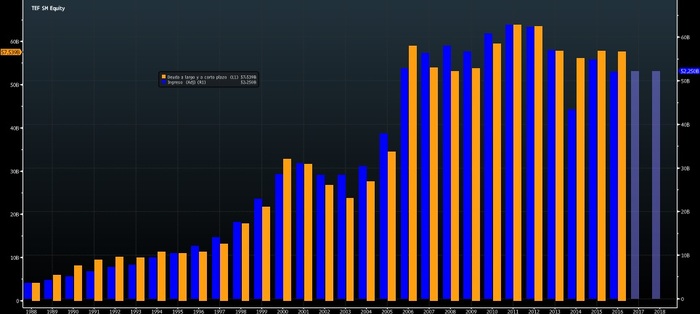 La forma de analizar el volumen de deuda de una empresa tiene diferentes ángulos. Lo normal y como se suele ver más a menudo es hacerlo sobre Ebitda, aunque en el caso de Telefónica se hace sobre Oibda (Resultado Operativo Antes de Amortizaciones) que es una magnitud distinta pero que calibra más o menos igual el volumen de negocio. El objetivo, que parece cumplido, es que este año la deuda neta caiga hasta 2,72 veces el Oibda gracias a la mejora de gastos financieros (Este es el motivo por el que decíamos en Merca2 que Alvarez-Pallete le debe una a Draghi), y la venta de activos, que son extraordinarios, como el 40% de Telxius, operación que ayer mismo se cerraba. A pesar de ello, la deuda sigue muy por encima de un nivel estable, y eso hace poco recomendable invertir en la compañía a medio y largo plazo.