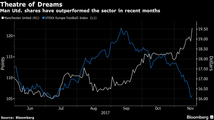Las acciones de Manchester United subieron 4% a 19,65 dólares por título en Nueva York, llevando las ganancias del 2017 hasta la fecha al 39%. El desempeño de los papeles refleja el mayor interés de los inversores en la estrategia digital de la compañía, así como el mejor desempeño en el el campo, según el analista de JPMorgan & Chase, Alexander Mess, quien mantiene una calificación de “sobreponderar” en la compañía.