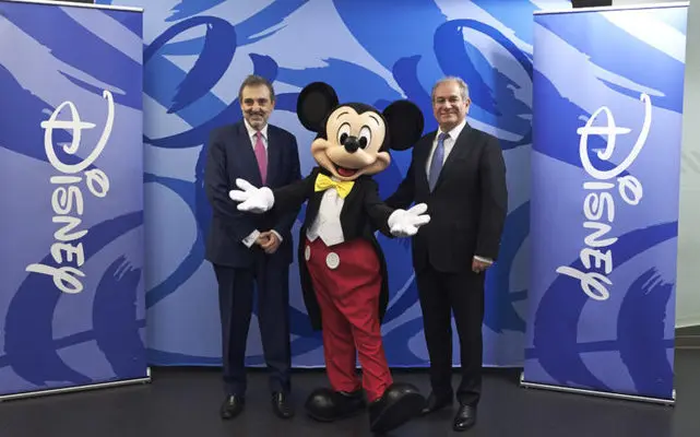 Todo muy cinematográfico en Gran Vía 28. Al subir las escaleras, están iluminadas con el logotipo de Disney. La música que suena, suena (valga la redundancia), a película de Disney. Y, antes de explicar el acuerdo, un photocall del presidente de Telefónica España, Luis Miguel Gilpérez; y el CEO de The Walt Disney Company en España y Portugal, Simón Amcelem; y personajes de la compañía norteamericana. Todo muy de estreno de película para anunciar el nacimiento de Movistar Disney. Sólo faltaba la claqueta y decir: ¡acción!