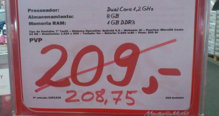 Parece que Media Markt también se une a esto del ahorro y ofrece un precio estupendo por su nueva tablet de Samsung. Anteriomente la tablet se podía comprar por 209 euros, pero ahora encontramos una superoferta en la que podemos adquirir la tablet por 208,75 euros. Vamos, un auténtico ahorro de veinticinco céntimos de euro.