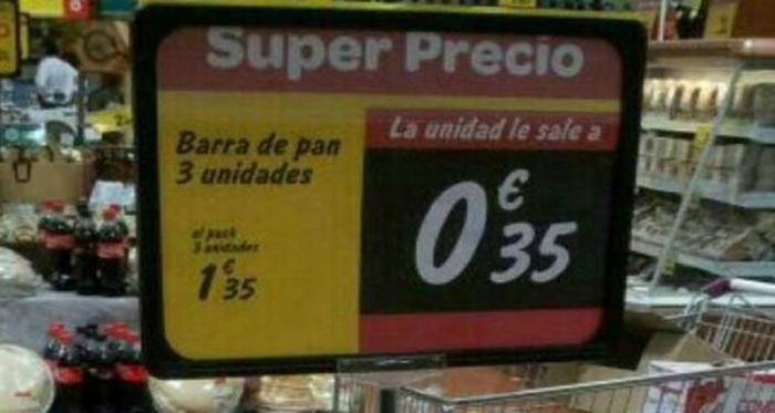 Parece que los chicos que ponen las ofertas de supermercado no saben hacer muy bien las cuentas ya que tres unidades de barras de pan a 0,35 céntimos no da 1,35 euros, sino 1,05 euros. Fijaos siempre bien en estos pequeños detalles e informad si hace falta al encargado.