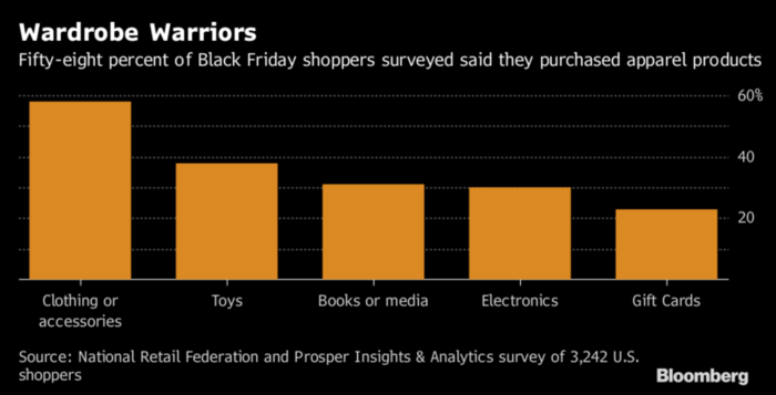 La ropa y los accesorios fueron la categoría de productos más grande durante el fin de semana largo, seguidos por juguetes, libros y productos electrónicos.