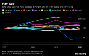 Por ahora, las brechas entre las naciones euro más ricas y las más pobres no se amplían, lo que es alentador para la viabilidad futura del euro. La diferencia en los salarios reales entre la mayoría de los países del bloque se ha reducido.