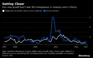 Los inversores han retomado la creciente sincronización. Un crecimiento más rápido y un déficit presupuestario más estrecho en Portugal, por ejemplo, han impulsado la demanda de los inversores de poseer sus bonos a 10 años sobre los de Alemania a un mínimo de dos años y medio. Pero avanzar hacia la clase de prosperidad prometida cuando se creó la unión monetaria requiere más que la conformidad en las tasas de crecimiento.