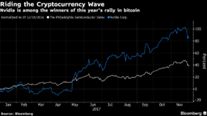 Las acciones como Nvidia han estado en racha gracias a las criptomonedas, con un avance de 85% en 2017, más del doble que el índice de semiconductores. La demanda relacionada con la moneda digital de Nvidia y Advanced Micro Devices (AMD), que representa un estimado de 6% y 10% de los ingresos respectivamente, será “mucho menos significativa” el próximo año, según Vijay Rakesh, analista de Mizuho Securities.