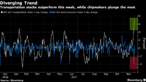 Echemos la culpa a la rotación, como titulares en el plan impositivo de Donald Trump combinados con la preocupación de que los precios de los chips de memoria destruyan a los semiconductores durante una semana cuando los inventarios de transporte, los bancos y las compañías telefónicas se dispararon. Las ganancias en los grupos vistos como beneficiarios de las políticas del mandatario elevaron al S&P 500 cerca de 1,5% durante la semana, incluso cuando la agitación política desencadenó la mayor ola de ventas intradía del índice en casi siete meses.