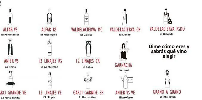 Si se es más de tintos: Valdelacierva Garnacha, ese instinto que se tiene para transmitir las características de una uva como la garnacha. Ruda pero a la vez fácil de trato, especial, única. Es un vino que descodifica lo estándar y que se mueve con soltura entre aromas a terruño y la suavidad y delicadeza que le aporta la madera. Valdelacierva Maceración Carbónica: El goloso. Explosión de fruta y total “golosura” del conjunto. Un lujo de juventud con exquisita personalidad. Un vino que hará recordar las «chuches», la piruleta. Es redondo y se lleva muy bien con sus compañeros de mesas. Divertido en todas las ocasiones. Valdelacierva crianza: El dandy. Una concepción moderna y, atrevida, en la crianza de un vino, sin perder los orígenes de la tradición secular de La Rioja. Un vino dinámico que no dejara indiferente a nadie. Destaca por su elegancia, refinamiento y domina a la perfección la variedad reina de Rioja, la Tempranillo. Conoce los códigos de Rioja, sus buenas prácticas. No es extravagante, no sigue tendencias, las crea. Anier Vendimia Seleccionada: La reina. Contundente y amable. Marca tendencias basadas en su personalidad, diferente a lo establecido como norma. Nunca pasa desapercibido. Una doble personalidad que juega con sus letras para pasar desapercibido como la Reina de las mejores ocasiones y compañía. Edición limitada de un complejo y potente vino donde la fruta y la madera juegan su papel. 12 Linajes Reserva: El gentelman. Un vino para las damas y caballeros del siglo XXI, que saben apreciar lo mejor, cultivar la tradición y rodearse solo de lo más auténtico, un vino que forma parte de una gran leyenda, la leyenda de los 12 Linajes. Nada de “postureo” es para disfrutar y quedar a lo grande sin renunciar a la nobleza del vino. 12 Linajes Crianza: El sabio. Habilidad de conjugar lo clásico con lo moderno, para llegar a los paladares exquisitos que demanden un excepcional Ribera del Duero. ¡Maravilloso! La personalidad del vino hace ser los “sabios”, los más listos de la clase, del trabajo, del equipo por eso este crianza no deja indiferente a nadie.