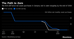 El Banco Central Europeo (BCE) pasará el 2018 guiando su programa de compra de bonos gentilmente hacia su fin una vez que la zona euro se beneficia del crecimiento más sincronizado en dos décadas, de acuerdo con una encuesta de Bloomberg.