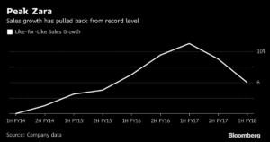 Las acciones del propietario de Zara han caído 4,5% en 2017, poniéndolas en curso para su peor año desde 2008. Aunque la caída es mucho menor que para sus pares, incluidos Hennes & Mauritz (descendió 22%) y Esprit Holdings (ha retrocedido 35%), ilustra que incluso los mejores en el negocio no son inmunes a los desafíos de una competencia en línea y de descuento cada vez mayor.