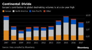 Europa, a menudo rezagada en comparación con los Estados Unidos en materia de fusiones y adquisiciones, ha resultado ser el punto caliente de los acuerdos en 2017.