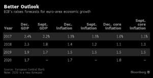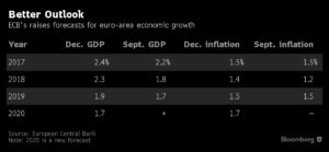 Reforzada por el estímulo del BCE y la recuperación económica mundial, la zona euro ha registrado 18 trimestres consecutivos de expansión desde que salió de una recesión de doble caída, y las encuestas de opinión apuntan a un impulso acelerado. Las sorpresas de crecimiento son posibles, mientras que los riesgos a la baja son en su mayoría factores globales relacionados.