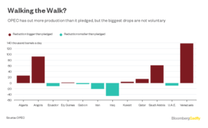 Por su parte, la OPEP ha hecho un trabajo impresionante al mantener sus armas, y sus amigos fuera del grupo tampoco lo han hecho mal. En general, el cumplimiento de la OPEP con los recortes acordados fue de 121% en noviembre, de acuerdo con los datos de fuentes secundarias que el grupo usa para monitorear el trato.