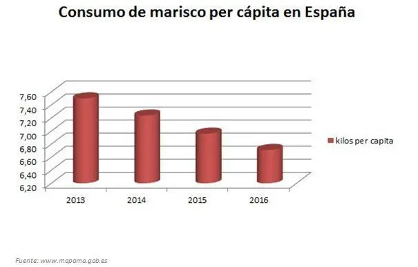 En este sentido, desde 2013 el consumo per cápita de mariscos ha pasado de los 7.5 kg a los 6,71 kg del 2016 según los datos publicados por el Ministerio en su panel de consumo alimentario. Esto supone en términos porcentuales un 9 % de reducción y, lo que más preocupa al sector, marca tendencia.