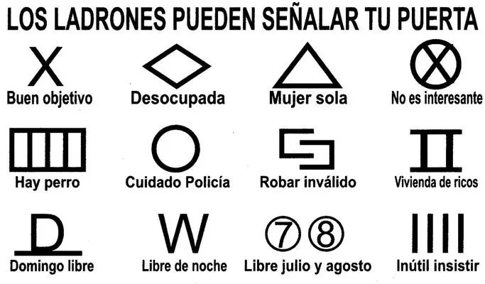 Un consejo es que se debe estar siempre atento a cualquier símbolo o marcas extrañas que aparezcan en el hogar. Este medio de comunicación de los ladrones se camufla, suelen ser pequeños dibujos cerca del timbre o marcas en la puerta.