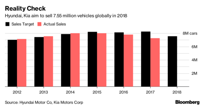 Hyundai Motor y su filial Kia Motors dijeron este martes que sus ventas combinadas en 2017 cayeron 7% a 7,25 millones de unidades, la menor cifra en cinco años y un millón menos que su objetivo récord.