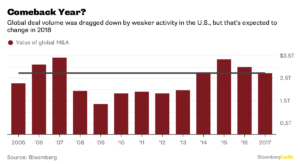 Hubo cerca de 2,7 billones de dólares en fusiones y adquisiciones globalmente el año pasado, la cifra más baja desde 2013. Esto se debe a que la actividad de toma de control en los Estados Unidos estuvo apagada durante gran parte del año ya que los CEOs lidiaron con los resultados inciertos de grandes propuestas legislativas y una administración ambigua de la Casa Blanca.