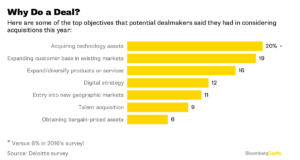 Después están las ofertas de complementos más pequeños. Estos son principalmente para activos tecnológicos, porque hoy en día todo el mundo quiere ser parte de este mundo. De hecho, el principal impulsor estratégico este año será la adquisición de activos tecnológicos, según una encuesta de alrededor de 1.000 ejecutivos corporativos y líderes de firmas de capital privado realizada para Deloitte.