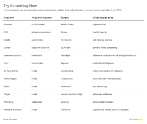 Una de las tendencias de grandes negocios de 2017 fue la difuminación de las líneas de la industria. Los minoristas compran software y puestos de avanzada en línea, los proveedores de servicios inalámbricos buscan contenido propio y Amazon.com, el rey del comercio electrónico, compró un minorista de alimentos básicos, Whole Foods.
