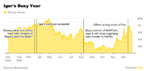 Fue la segunda mayor transacción del año a nivel mundial y la más grande desde la oferta de Time Warner por parte de AT&T en octubre de 2016. Disney ofreció comprar la mayoría de 21st Century Fox por unos 66.000 millones de dólares (54.910 millones de euros), un acuerdo en la que los magnates de los medios de comunicación de Murdoch, a cambio de acciones de Disney, le darán a Iger una mayor cantidad de contenido de televisión y cine para apoyar la incursión de la compañía en la transmisión en línea.