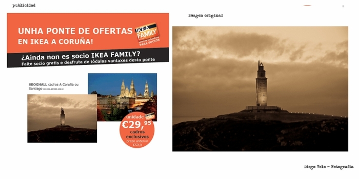 Este es el caso de la fotografía que podéis ver, que pertenece a Diego, un chico gallego que se dedica a la fotografía. Pues bien, Ikea ha decidido coger la imagen original y ponerla en su catálogo de ofertas de Ikea. Lo mejor de todo es que son ofertas en A Coruña, por lo que era muy probable que el chico, tarde o temprano, viese su foto publicada.